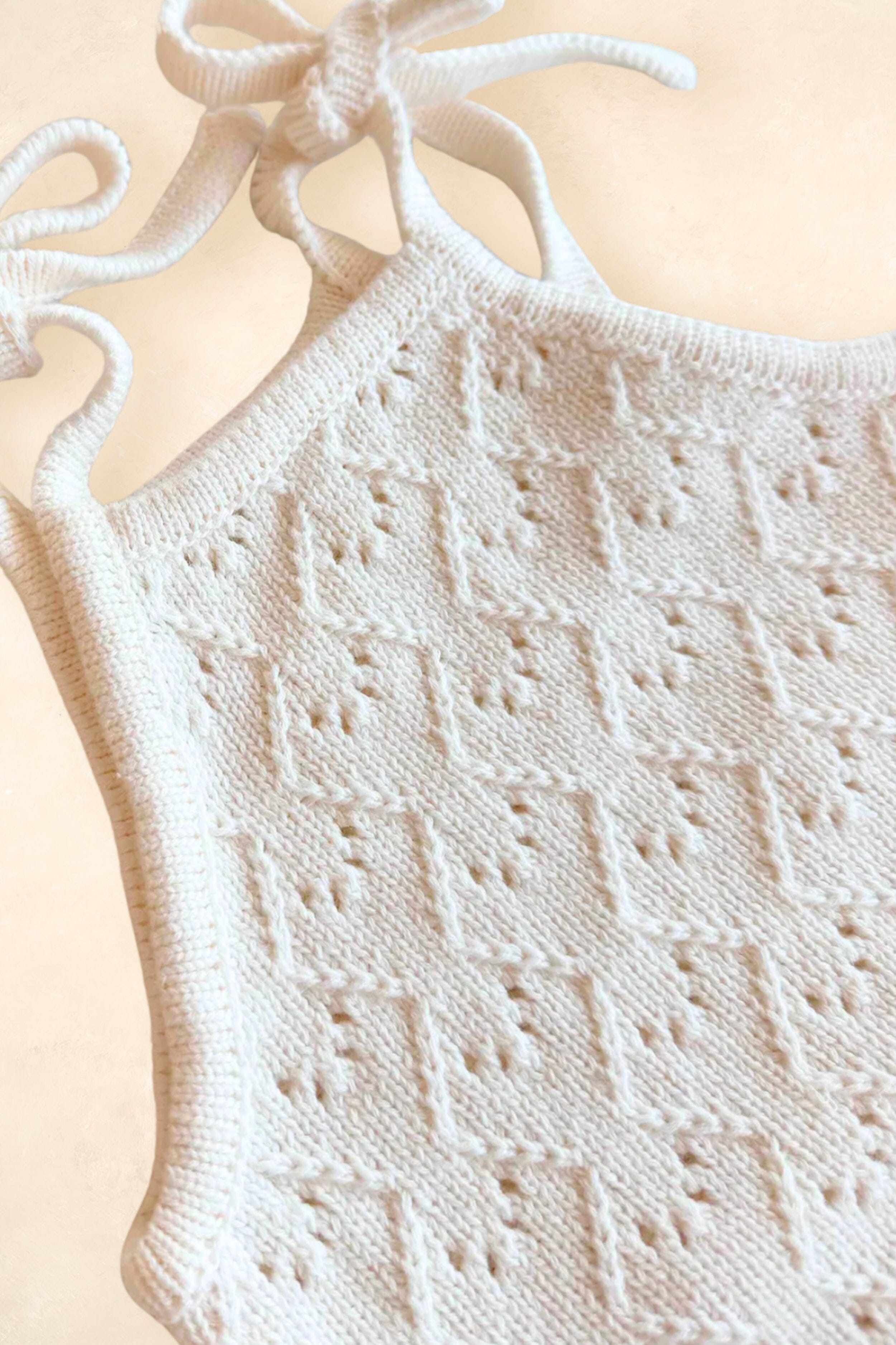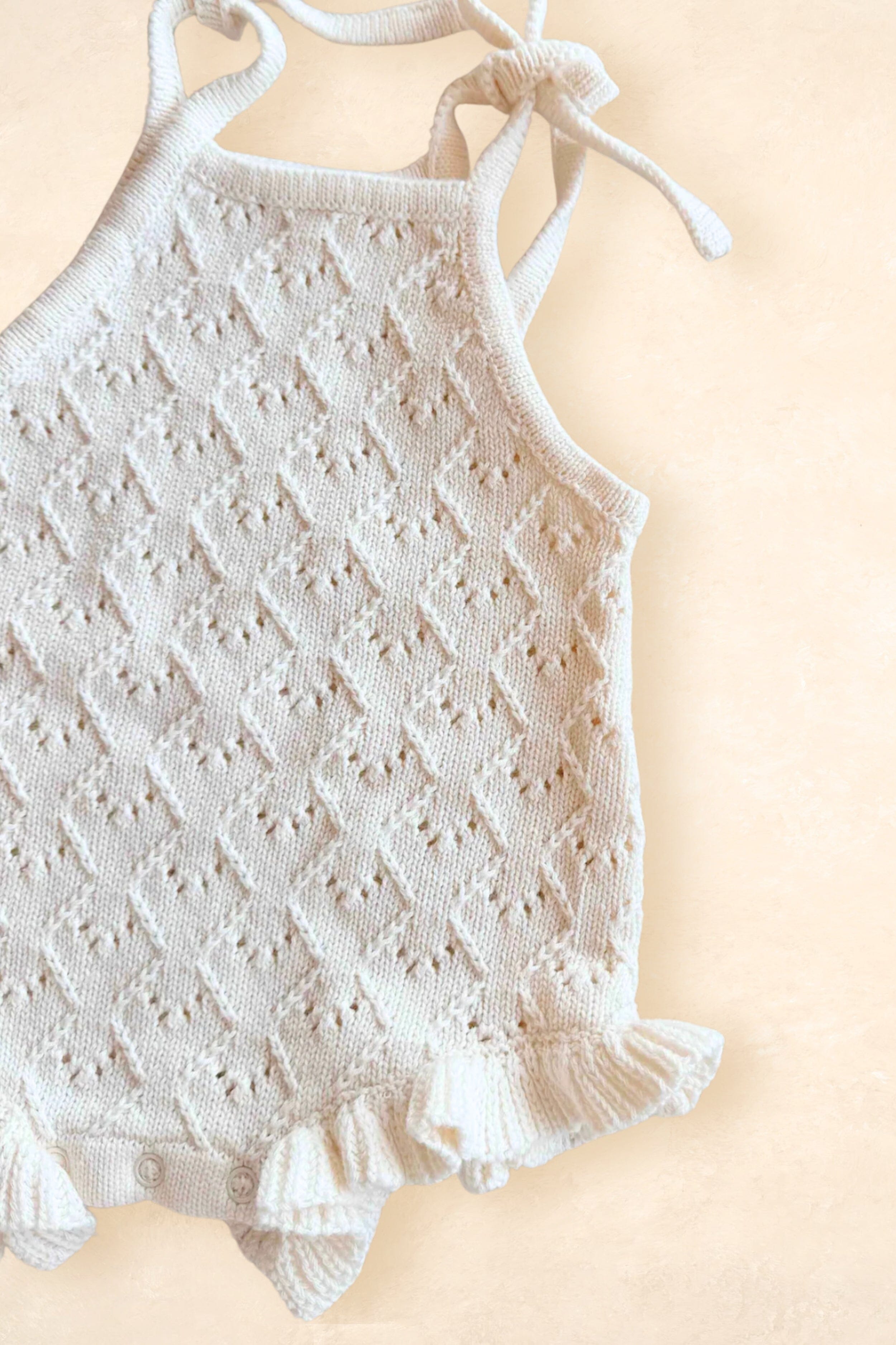 The Mila Pointelle tie Romper is perfect for warmer days or layered for winter. It's beautifully knitted in our signature pointelle design. Perfect for baby's first outfit, special days, or photos, this romper is made to keep and treasure. Simple, pretty, and timeless.
